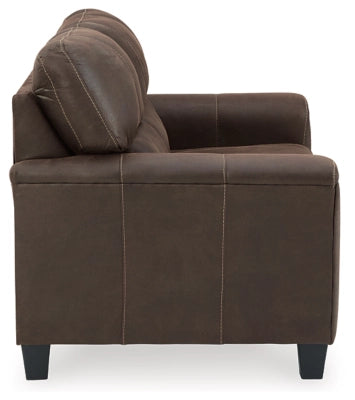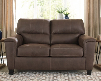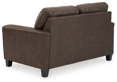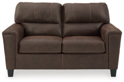 Material : If you love the cool look of leather but long for the warm feel of fabric, you can take comfort in the Navi loveseat. Wrapped in a fabulous faux leather with a weathered hue and hint of pebbly texture to resemble the real deal, this decidedly modern loveseat proves less is more. Elements include angled side profiling and track armrests wrapped with a layer of pillowy softness for that little something extra. Prominent jumbo stitching and clean-lined divided back styling lend fashion-forward flair.